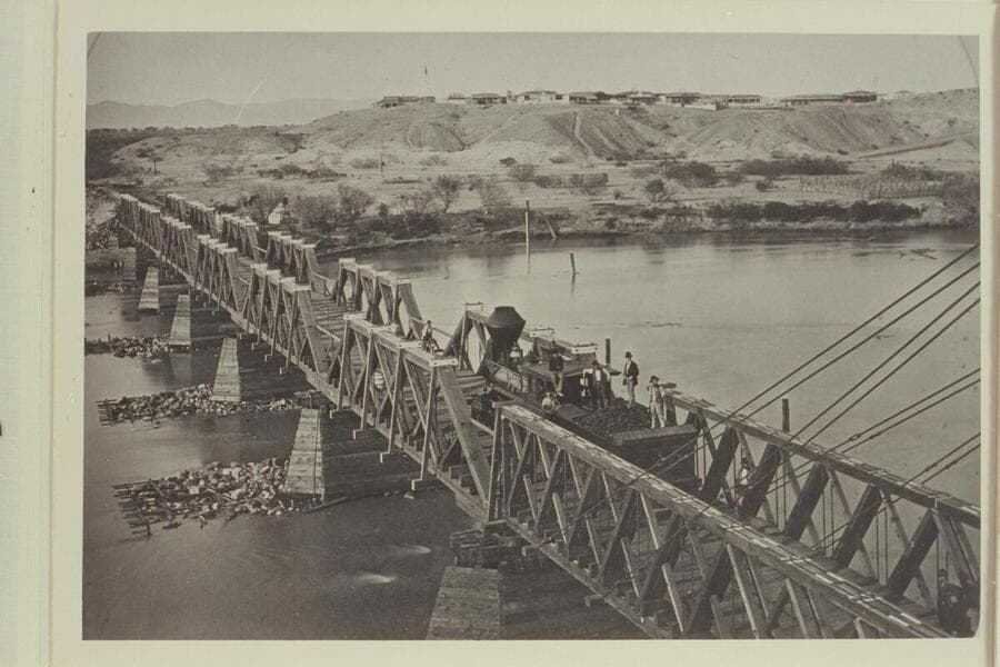 Southern Pacific Bridge at Yuma. "The bridge was completed in '77 but it was on or about 1880, Jan. 20 that the first train crossed into Arizona. The bridge had a lot of damage in a helluva flood in '78."