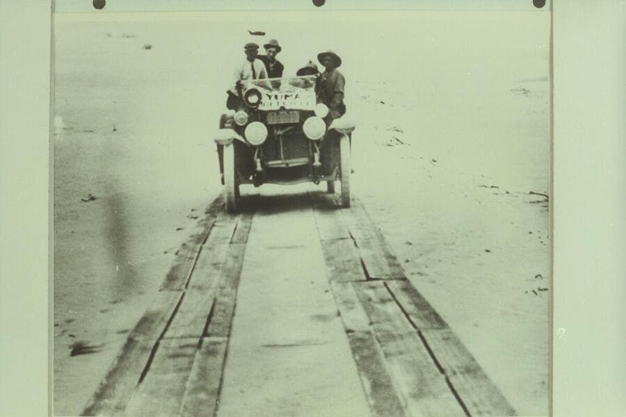 Plank road across sand dunes west of Yuma. May 1926