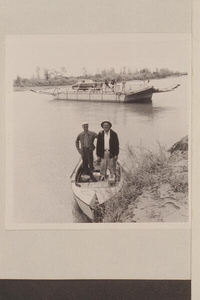 Ed Nichols and Ed Hudson in the 12-ft. outboard "Nancy." Lower Zacatecas Ferry, Colorado River, about 25 miles above Gulf. Photo made on return from run to Gulf