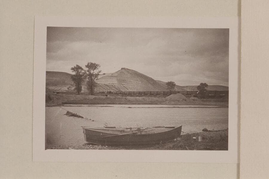 Buzz Holmstrom's boat at Green River, Wyoming, below the rail trestle where he started his solo run
