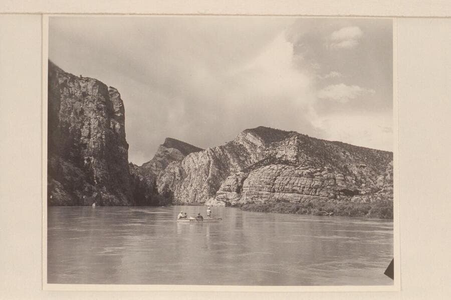 Nevills at the oars of the "Wen" at the foot of Kingfisher Canyon. Al Milotte stands in the bow