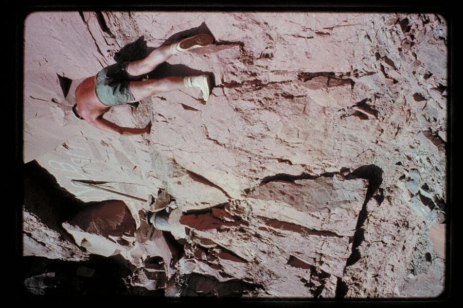 Bill Belknap climbs to the Kolb inscription at Mile 202.25, right bank. The inscription was painted by Emery Kolb 1911, Oct. 28