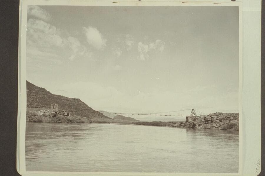 Old suspension bridge in Brown's Park, Mile 259.9, viewed by Shirley Marston in June 1947 when cruising with the Nevills party