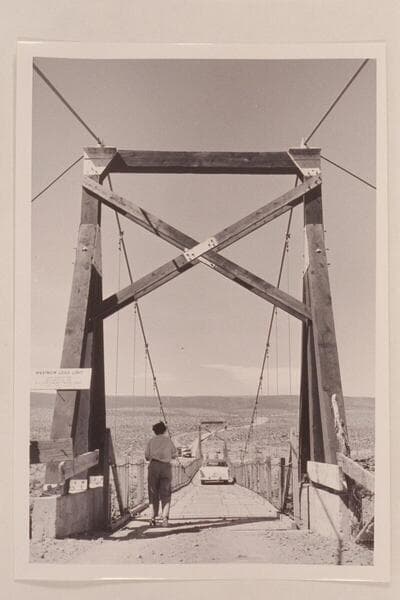 AK Reynolds truck and boats crossing new suspension bridge in Brown's Hole
