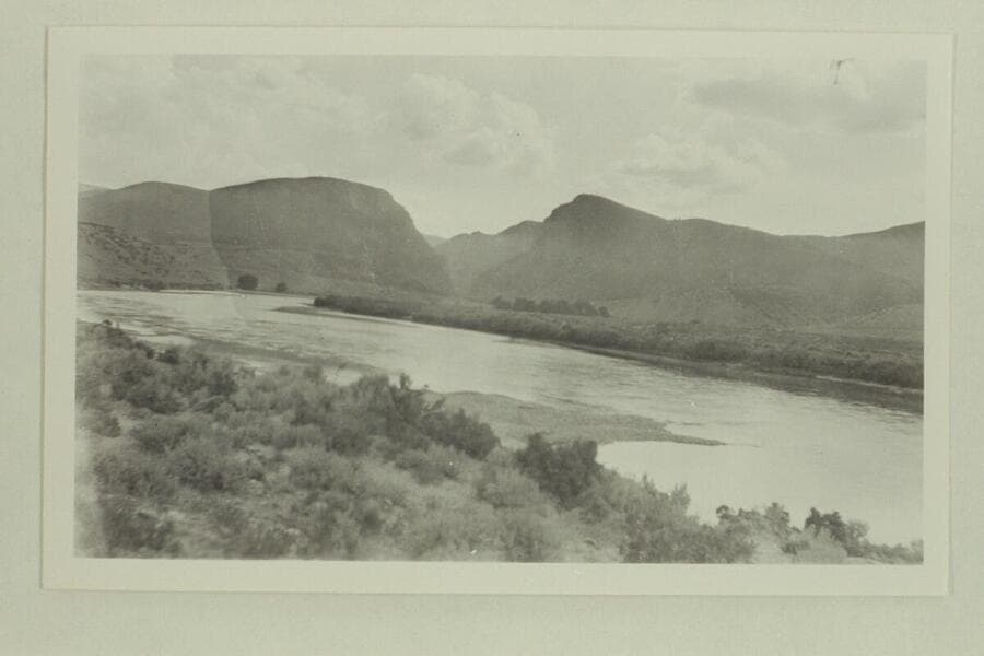 AK Reynolds, Marie and Joe Desloge float toward the Gate of Lodore; Brown's Hole, Green River. Below Vermillion Creek
