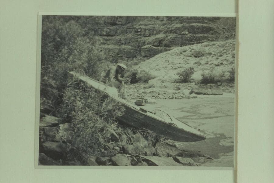 The "Illinois Girl" found on the upper Green River. She had been abandoned by Tony Backus. Holmstrom examines the wreck