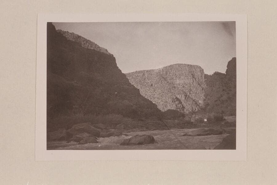 Looking up the Green River at top of Upper Disaster Rapid. One of the sadiron boats of Reynolds is approaching the head of the rapid
