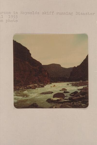 Lug Larsen in Reynolds skiff running Disaster Falls
