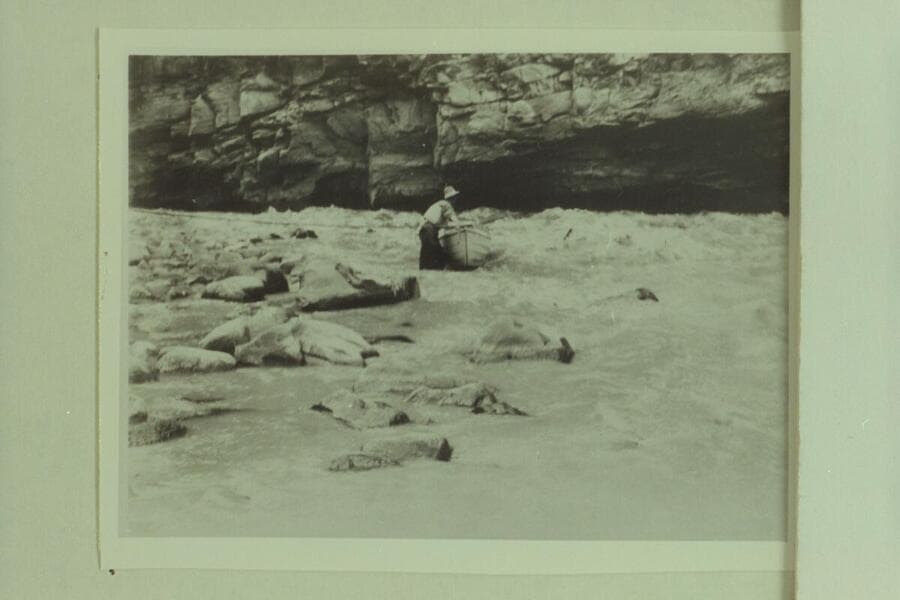 Lining of the Kolb boats at Lower Disaster Falls. Extreme low water