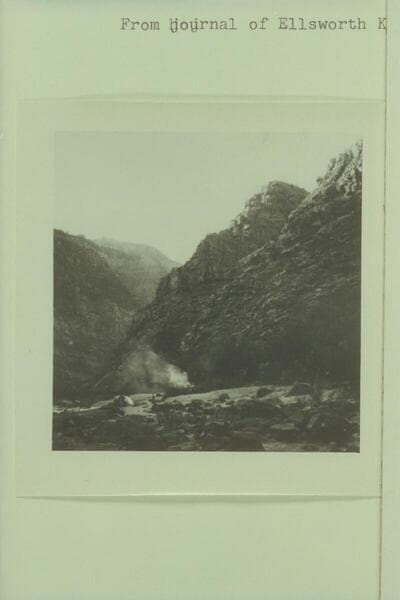 Emery Kolb setting up camp at the foot of Lodore Rapid; Triplet Falls