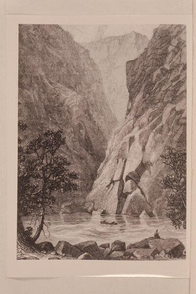 Canon of Lodore (illustration). The scene is a gilded version of Lodore looking downstream from the foot of Triplet Falls