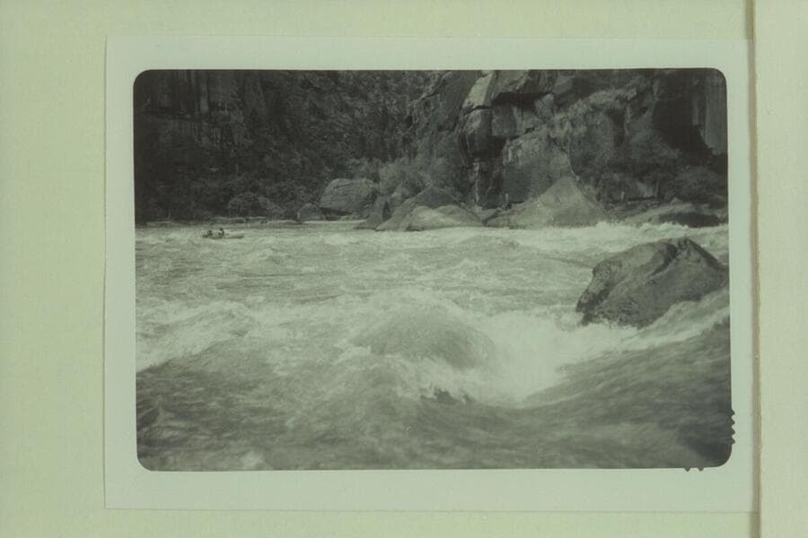 Mildred Davis pulling out below Triplett Rapid [on photo reverse: Mildred's run completed. Fern passenger]