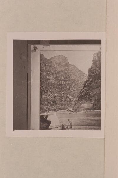 Emery Kolb setting up camp at the foot of Lodore Rapid; Triplet Falls