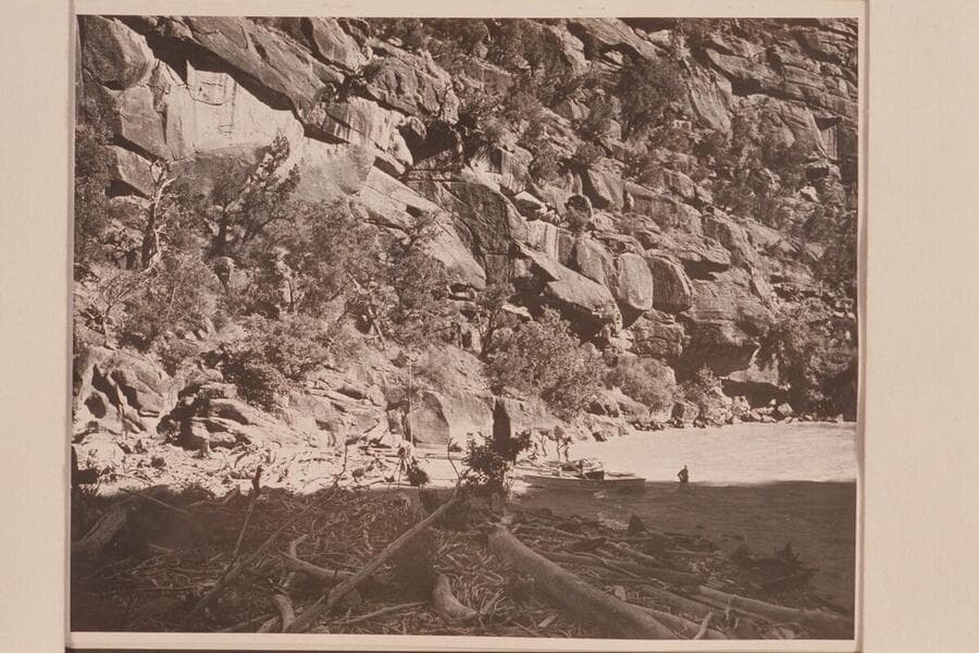 Kayak operations with the French Trio. The scene appears to be at the foot of Triplett Falls in the Canyon of Lodore