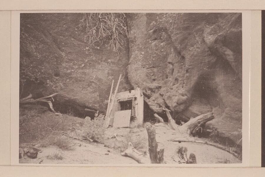 Shirley Morse Marston. Examining the stern section of the "Lota-ve" at the foot of Triplett Falls in the Canyon of Lodore