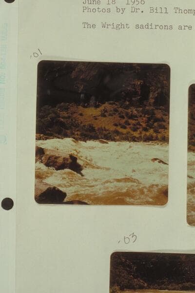 Portage of one of the Wright sadirons at Hells Half Mile. Frank Wright at the bow; Kent Frost at right; Alf Frost at left