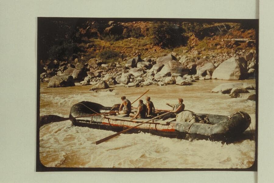 Bus Hatch's crew studying Hells Half Mile. Bus wears the cap and shirt. The others are Dale and Jack Collier, two boatmen, and Bill McLane, a passenger