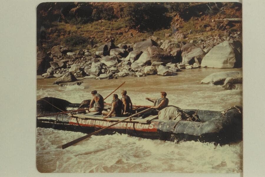 One of Hatch's pontoons bouncing rocks in lower end of Hells Half Mile