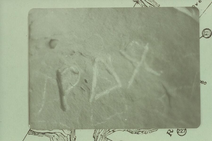 Inscription at Rippling Brook. P carved very deep; appears the AX was added later; not as deep as the P