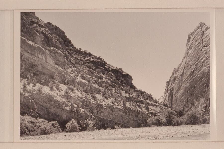 Lower end of Canyon of Lodore at Pats Hole; Echo Cliff on right. 1871, June 28, Steward and Clem had their fracas with a whirlpool along this shore at the left