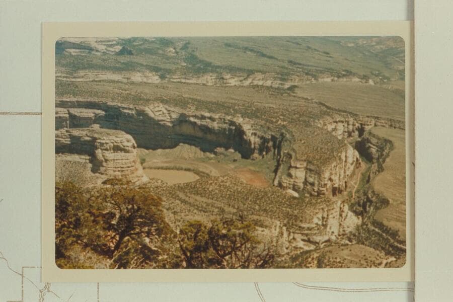 Echo or Steamboat Rock at Pats Hole. The lower end of the Canyon of Lodore is bototom left