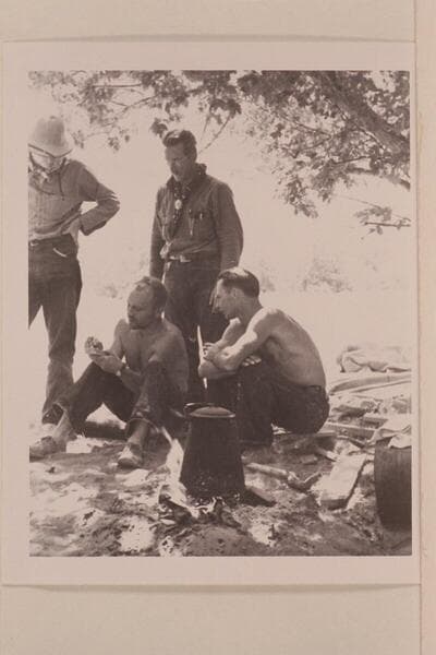 Buzz Holmstrom and Norm Nevills repairing one of the Nevills' skiffs at Pat's Hole