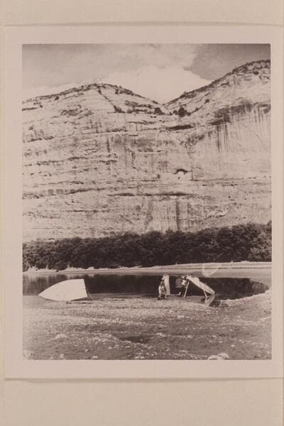 Buzz Holmstrom helping with the repair of one of the Nevills skiffs at Pats Hole. Note the short hold on the hammer