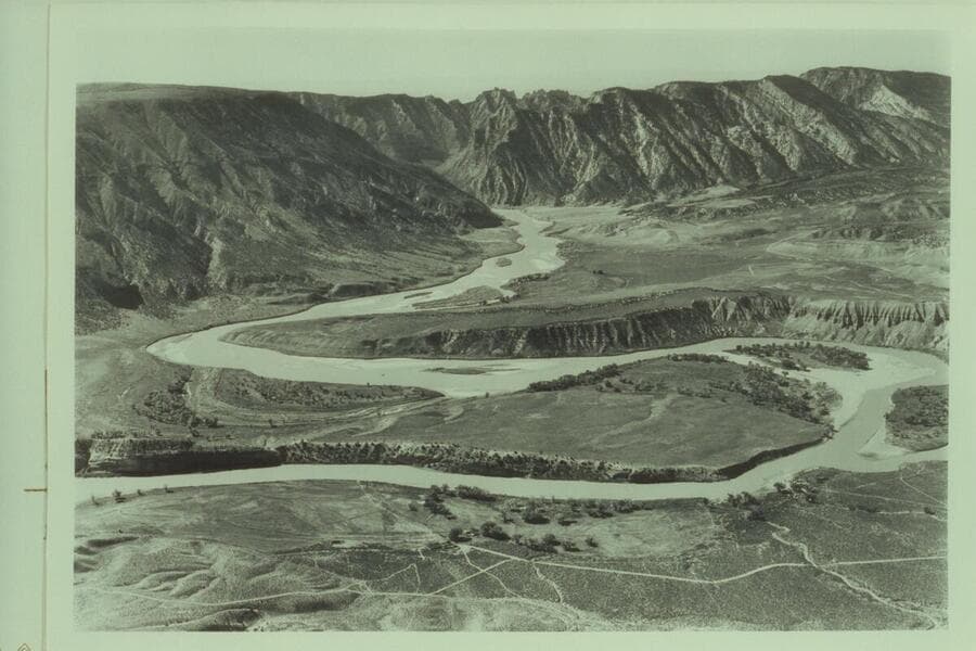 Island and Rainbow Parks looking downriver to the head of Split Mountain. Dinosaur National Monument. At lower left the Green River enters at about Mile 213 1/2