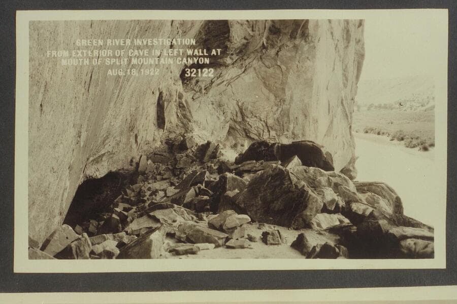 Green River Investigation; from exterior of cave in left wall at mouth of Split Mountain Canyon