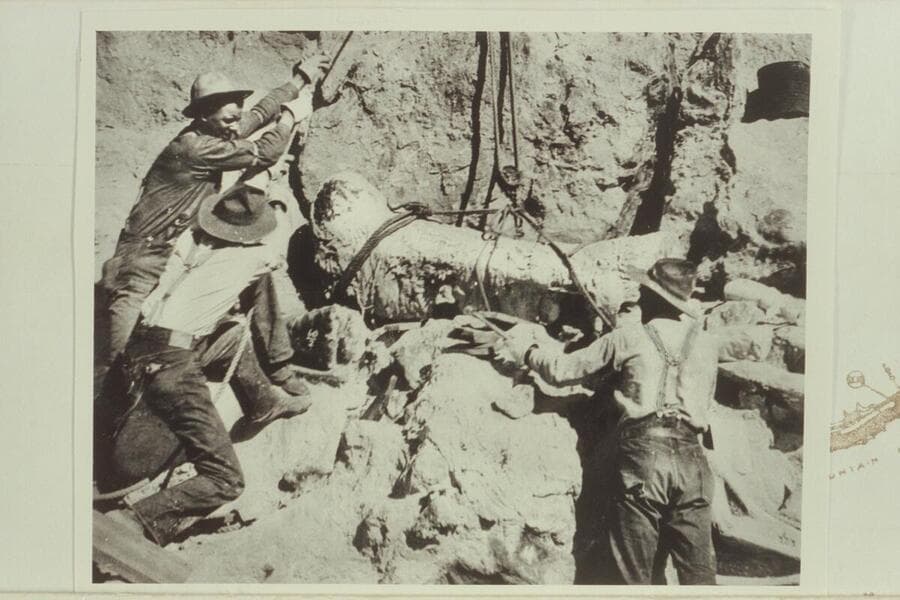 Carnegie Museum crew hauls plastered dinosaur bone to boxing area; Dinosaur National Monument