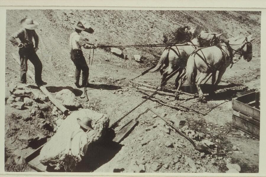 Carnegie Museum crew hauls plastered dinosaur bone to boxing area; Dinosaur National Monument