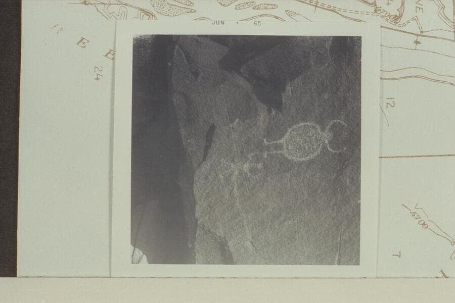 Prehistoric inscriptions on boulder at foot of talus below the White Rim; Mile 22 3/4, right bank
