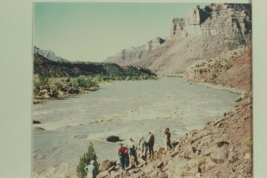 The Wright party studies the rapid at Mile 41.5, Desolation Canyon