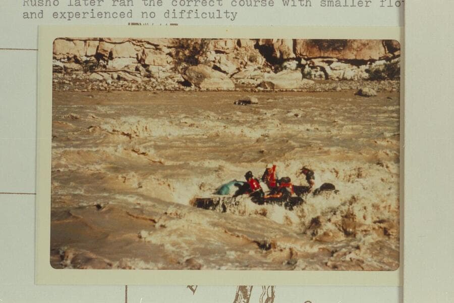 George Stewart's 10-man in the hole in Coal Creek Rapid and 10-15 ft. to right of course.Stewart, who is third from left, reported feeling the impact with a rock on the right beam.Rusho later ran the correct course with smaller flotation and no difficult