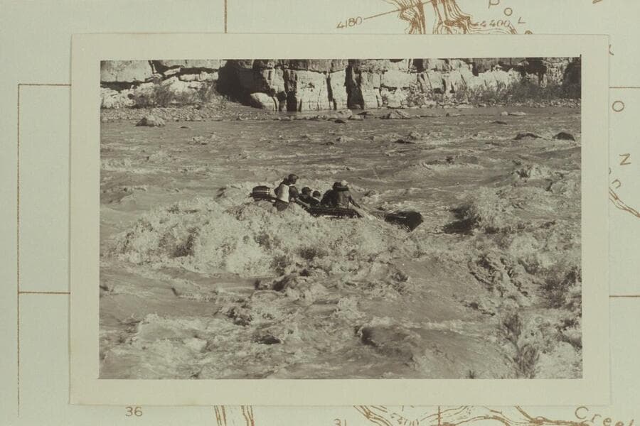 George Stewart's 10-man clears the heavy water in Coal Creek Rapid after filling and drowning the motor in a hole to right of the planned course