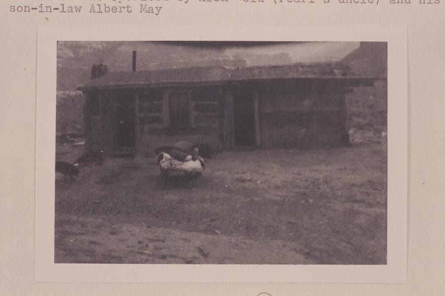 Cabin at ranch at mouth of Price River. The ranch was operated by Alex Reid (Pearl Baker's uncle) and his son-in-law Albert May