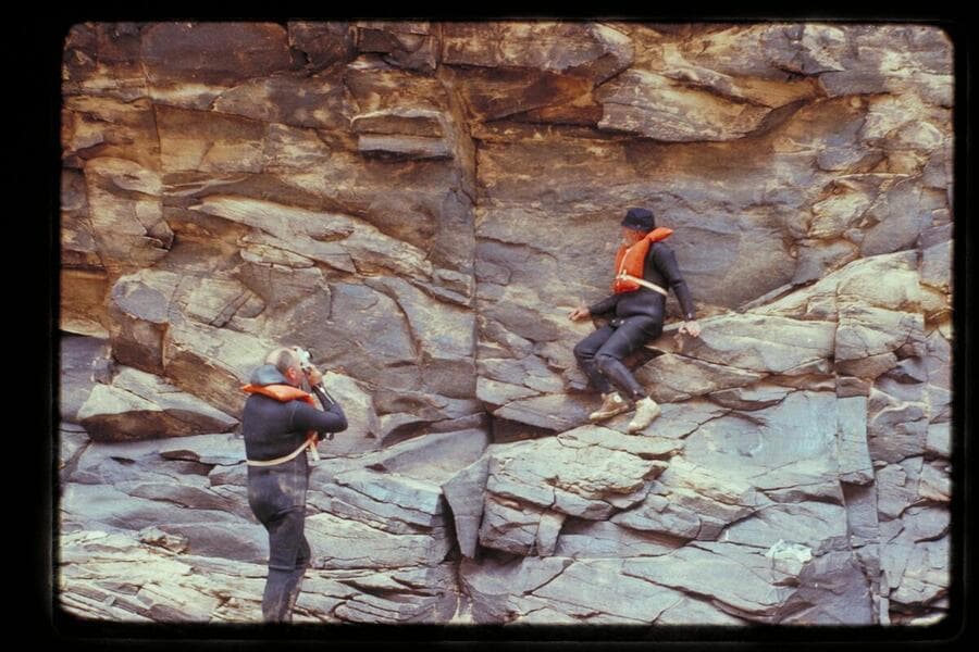 Dock Marston and Bill Belknap photographing the 1836 D. Julien inscription at Mile 185.75 left bank, Cataract Canyon