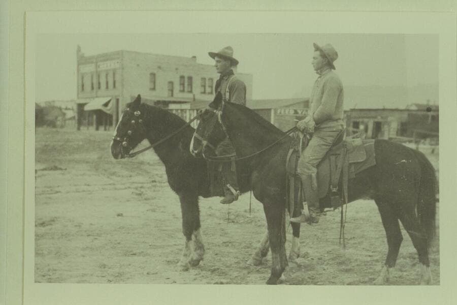 Probably near the old Metropole Hotel, Green River. Pat Brown at left and Kendrick Levi. Their activity was prospecting for oil in the Green River-Hanksville section