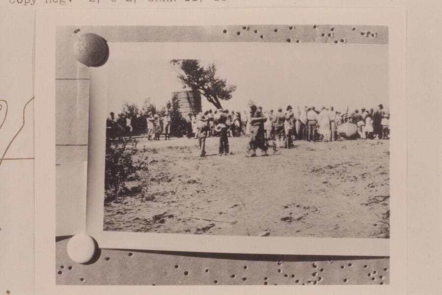 Townfolk of Green River, Utah, to watch the Eddy crew embark June 27, 1927. Two of the heavy boats copied from the Powell design are at right