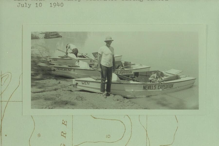 The three Nevills sadirons loading at Green River, Utah prior to departure for a transit of the river course to Lake Mead. Barry Goldwater facing camera