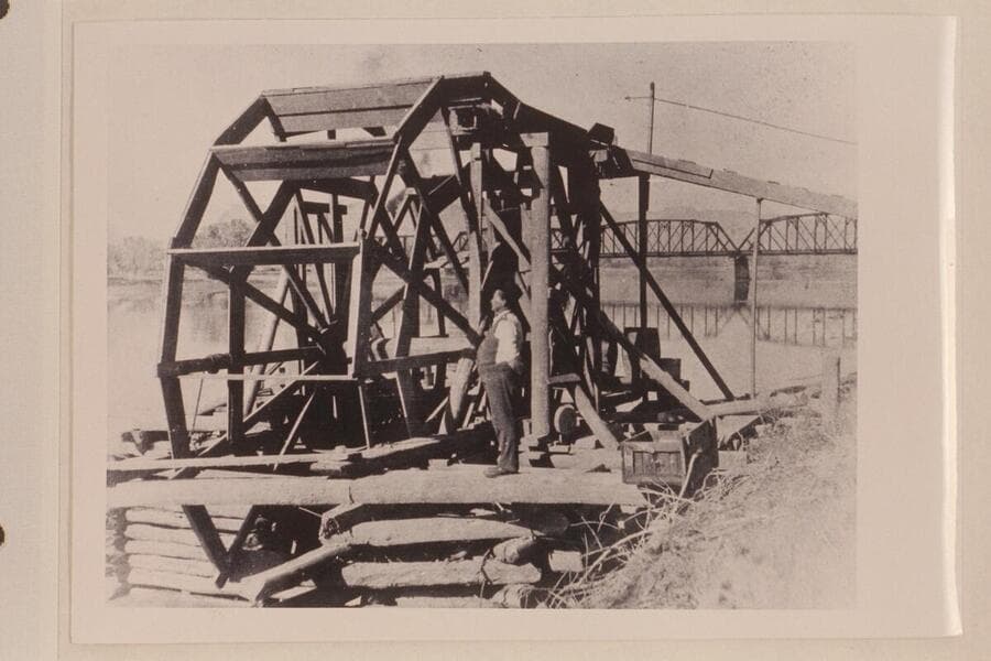 Water wheel just below railroad bridge. Green River at Green River, Utah
