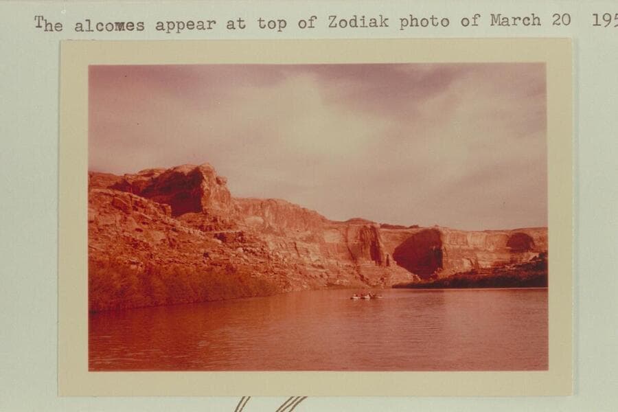 Up Green River from Mile 83.2 to the alcoves at Mile 84.2. The Brown-Stanton party camped opposite the alcoves May 27, 1889