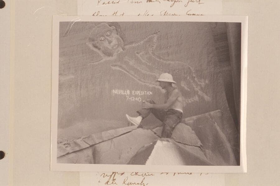 Fahrni and Bus Hatch near some of the inscriptions at The Billboard, Labyrinth Canyon, Mile 75.5
