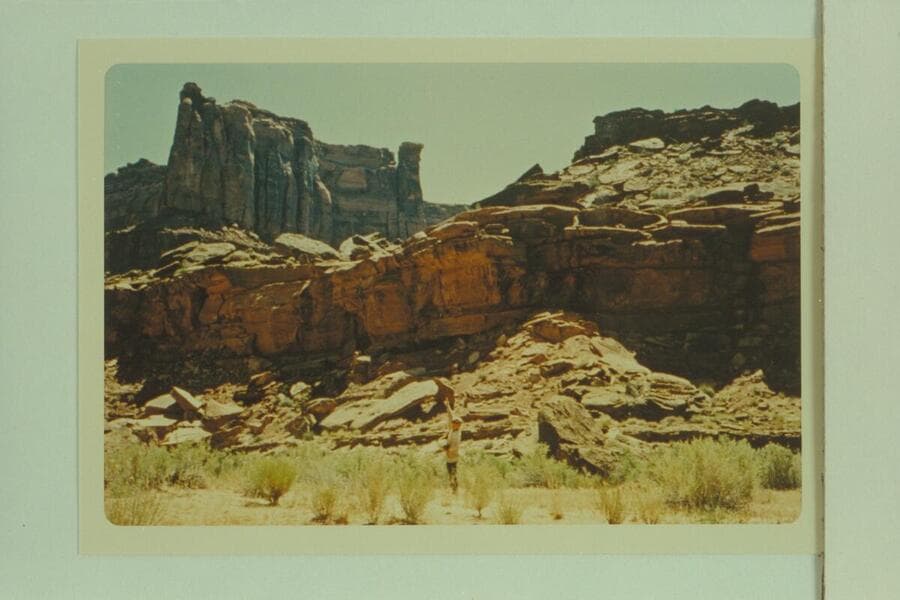 One of the Julien boys pointing to the D. Julien inscription in Hell Roaring Canyon