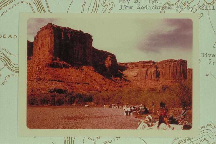 Boats of the CCMRA Friendship Cruise at Mineral Canyon. Mile 50.7, Labyrinth Canyon. It was necessary to stand in line to buy gas and oil