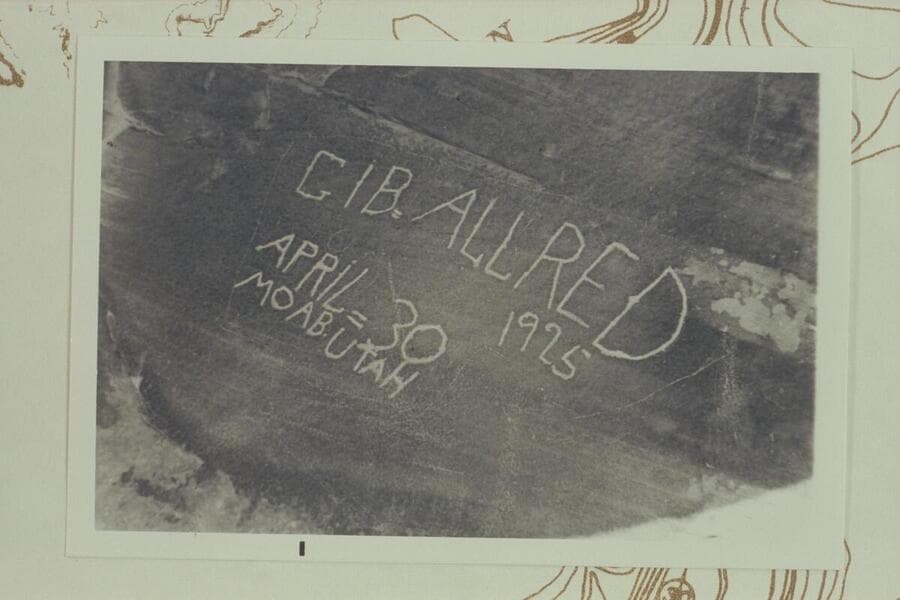 Inscription in cave of White Rim Formation at lower end of Beaver Bottom