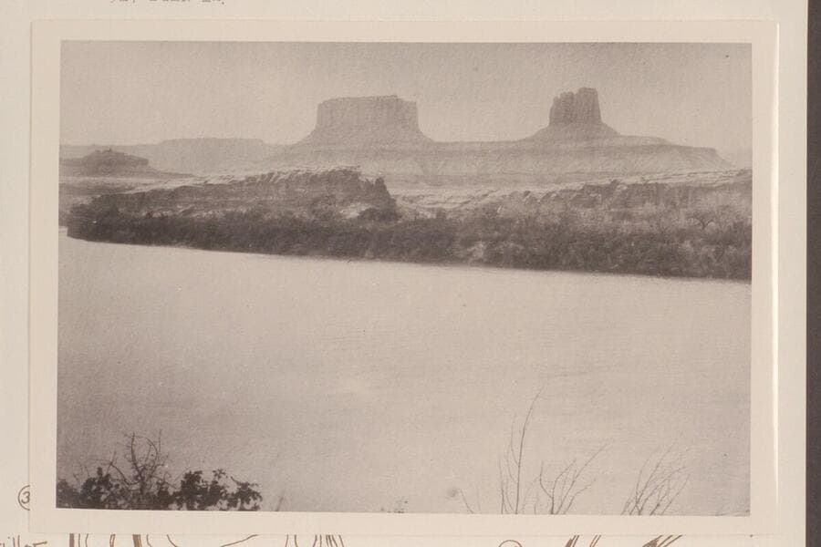 Buttes of the Cross. Crescent Castle; across Townsite Bottom from Mile 29.7. John Harvey Jacobs sits on the shore