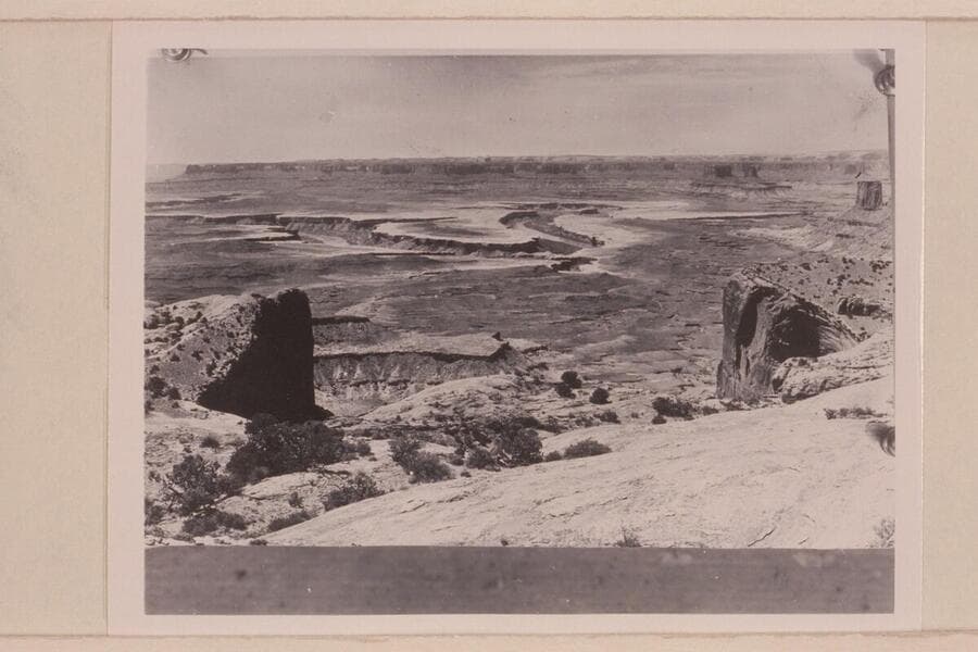 View southwest from Upheaval Dome--white rim sandstone edges the wide red Moenkopi bench. The Buttes of the Cross are upper right. Bonita Bend is center