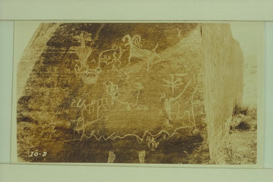 Prehistoric inscriptions on the down-river of two large boulders at the foot of the talus below the White Rim; Mile 22 3/4 right bank, Stillwater Canyon