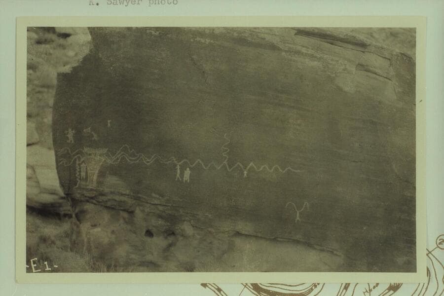 Prehistoric drawings on second large boulder at foot of talus below the White Rim; Mile 22 3/4, Stillwater Canyon